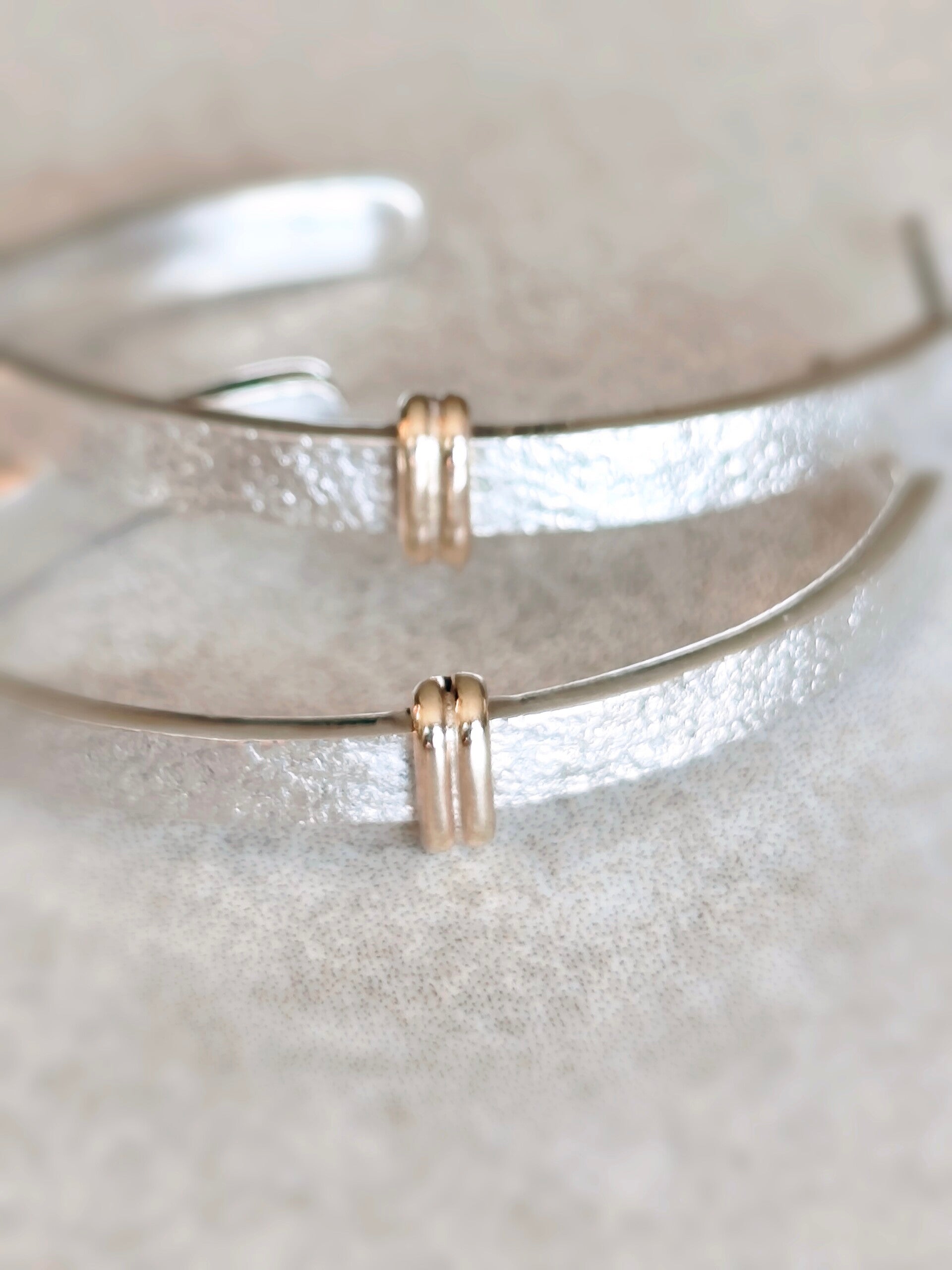 Boucles d’oreilles en argent martelé, rehaussées d’un détail d’or.