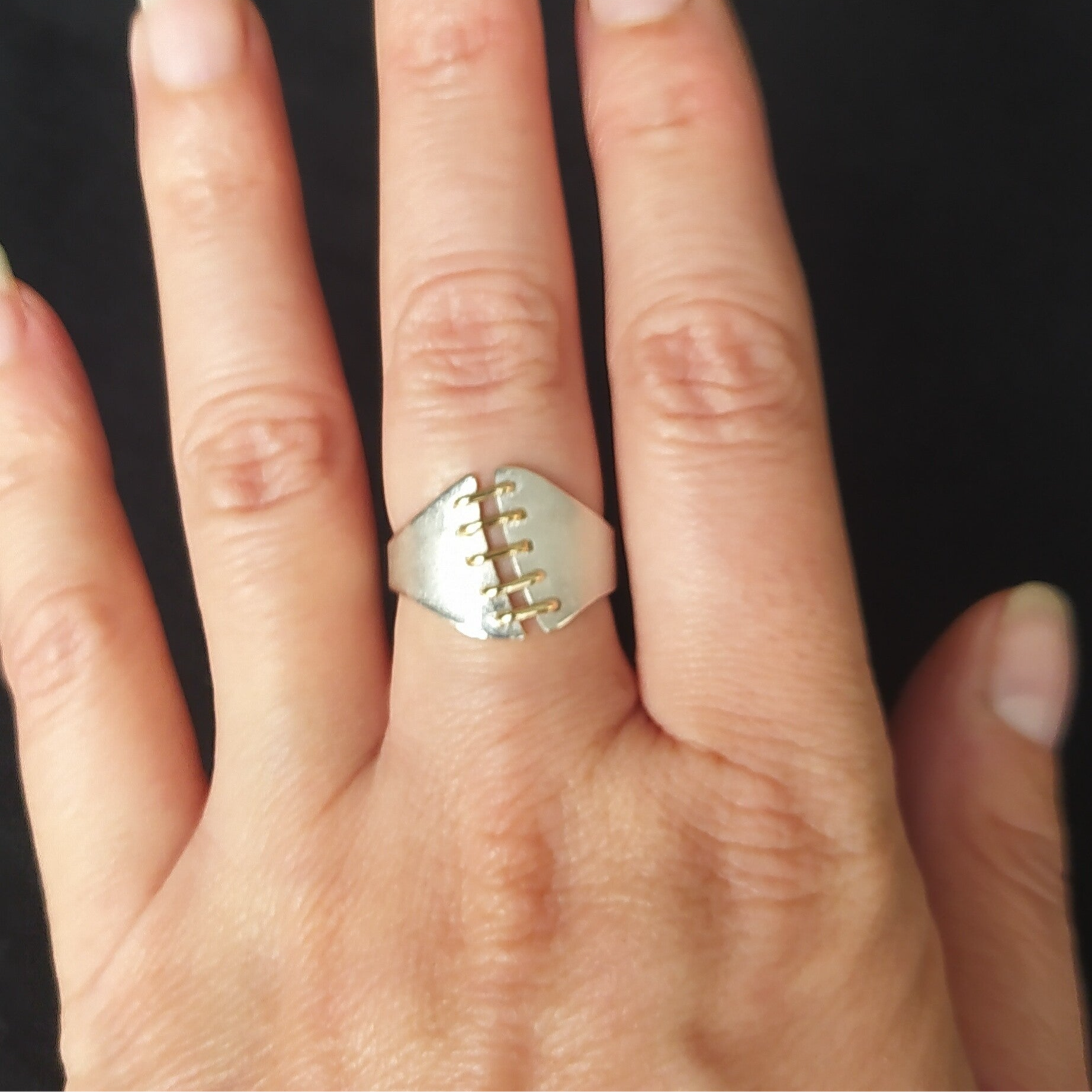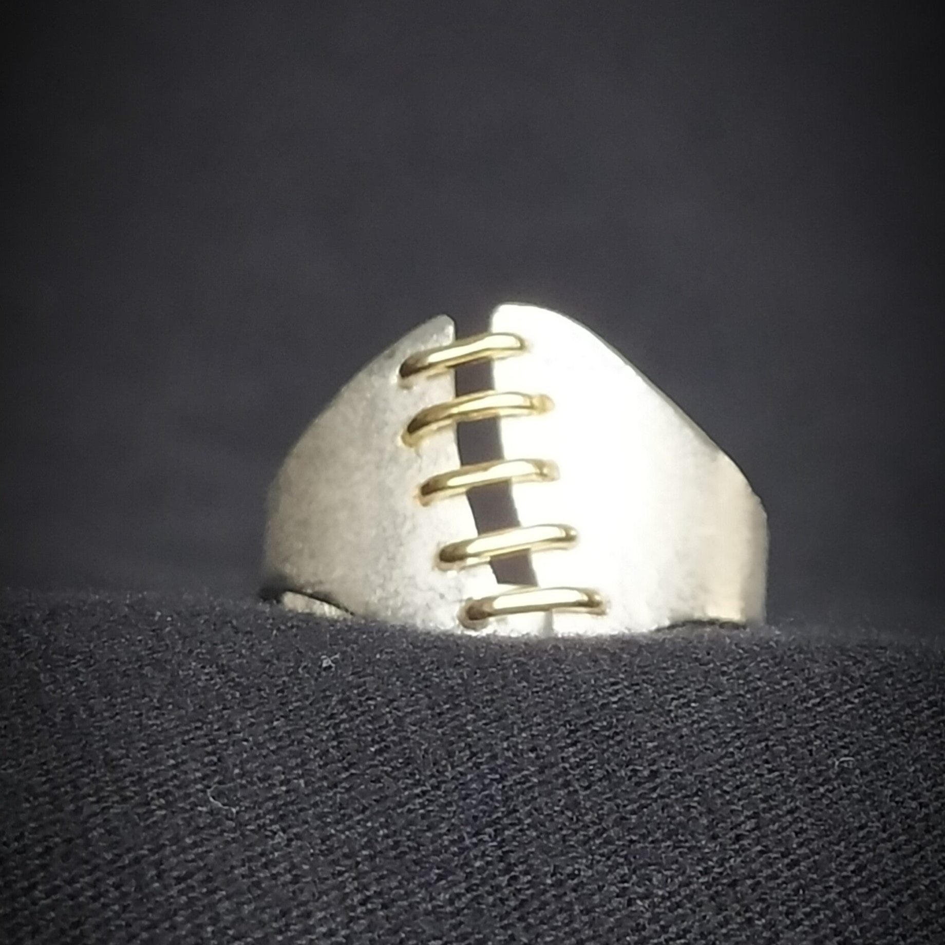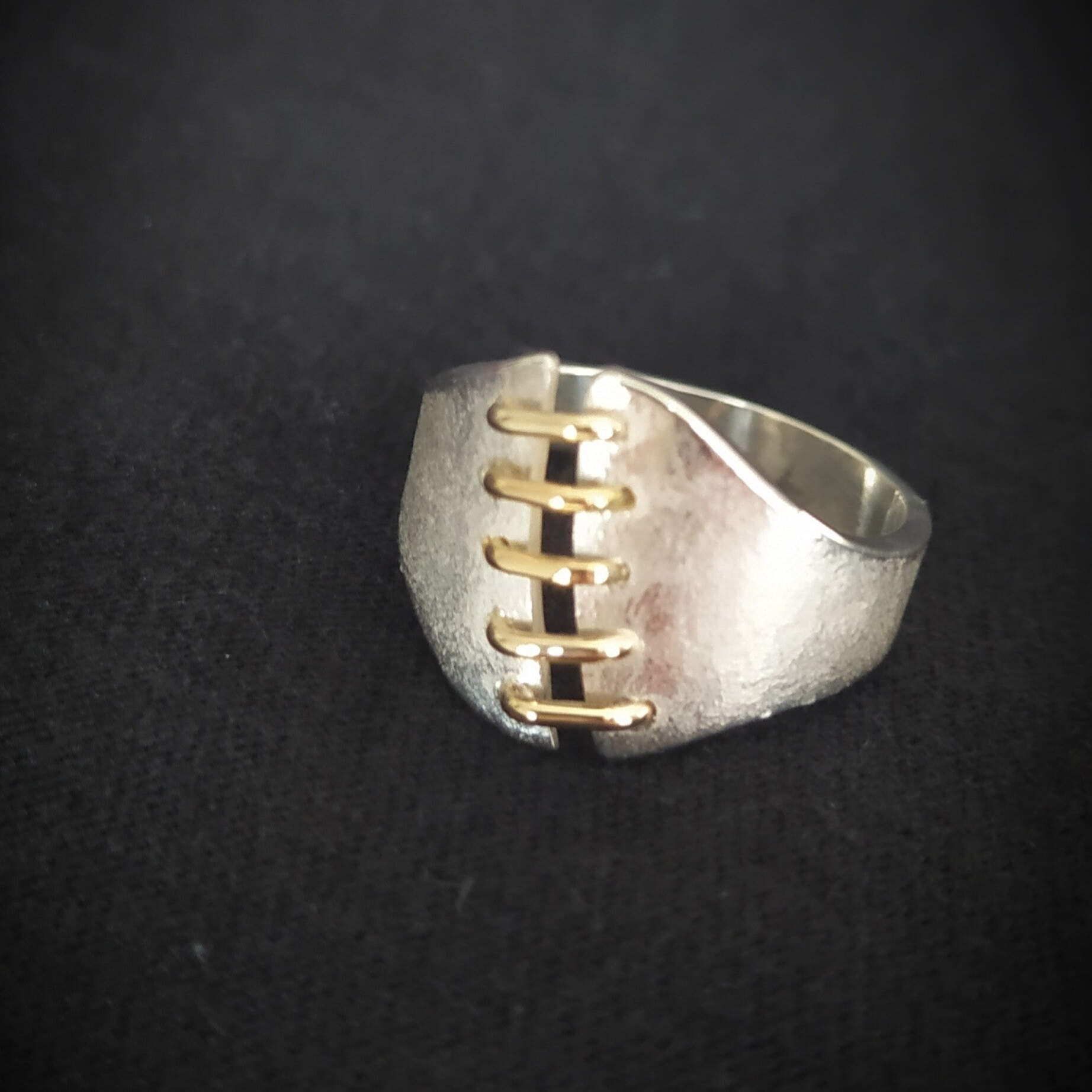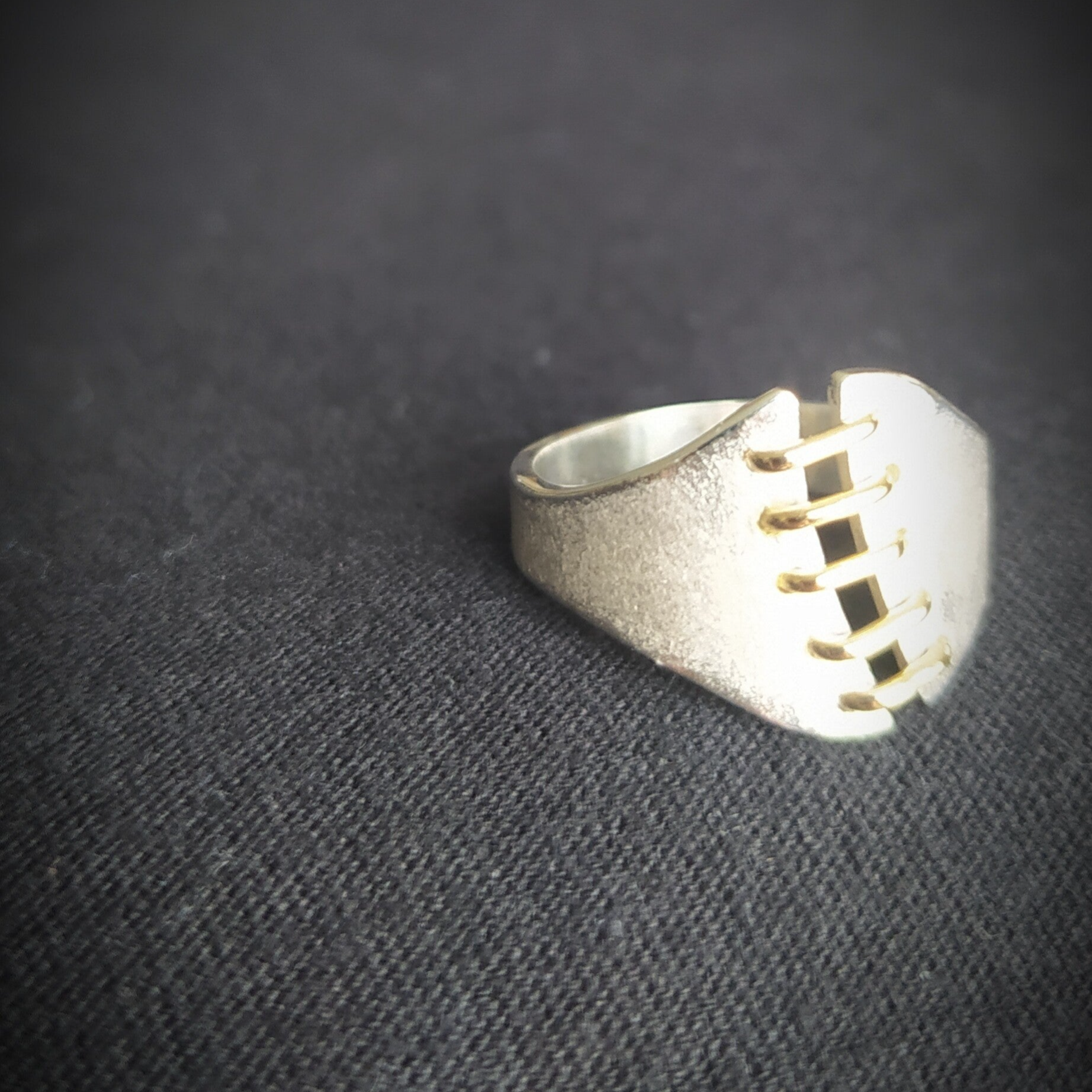 Cette bague artisanale allie élégance et originalité avec un design qui met en valeur l'art de la bijouterie fait main. Elle est en argent martelé ce qui donne un effet texturé unique et authentique, accentuant son caractère brut et raffiné. Chaque coup de marteau sur l'argent ajoute de la profondeur et de la brillance, reflétant la lumière sous différents angles. Un fil d'or est intégré naturellement dans la bague, rappelant une couture précieuse qui relie les éléments. La combinaison du martelage artisanale de l'argent et du fil d'or crée un style audacieux, sophistiqué. Parfait pour ceux qui recherchent une pièce à la fois contemporain et intemporelle.