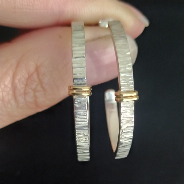 Courbe Précieuse, des boucles d'oreilles pendantes au design élégant et contemporain. Ces boucles d'oreilles ovales en argent martelé et or captent la lumière pour un éclat raffiné, parfait pour toute occasion. L' effet martelé apporte une texture unique qui met en valeur le contraste entre les deux métaux, ajoutant profondeur et caractère. Légères et confortables à porter, elles subliment à la fois une tenue de jour décontracté ou un look de soirée sophistiqué.