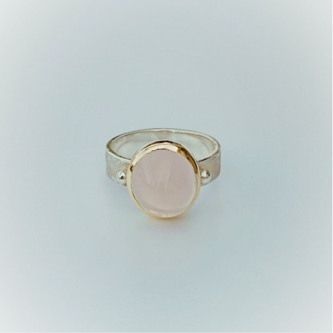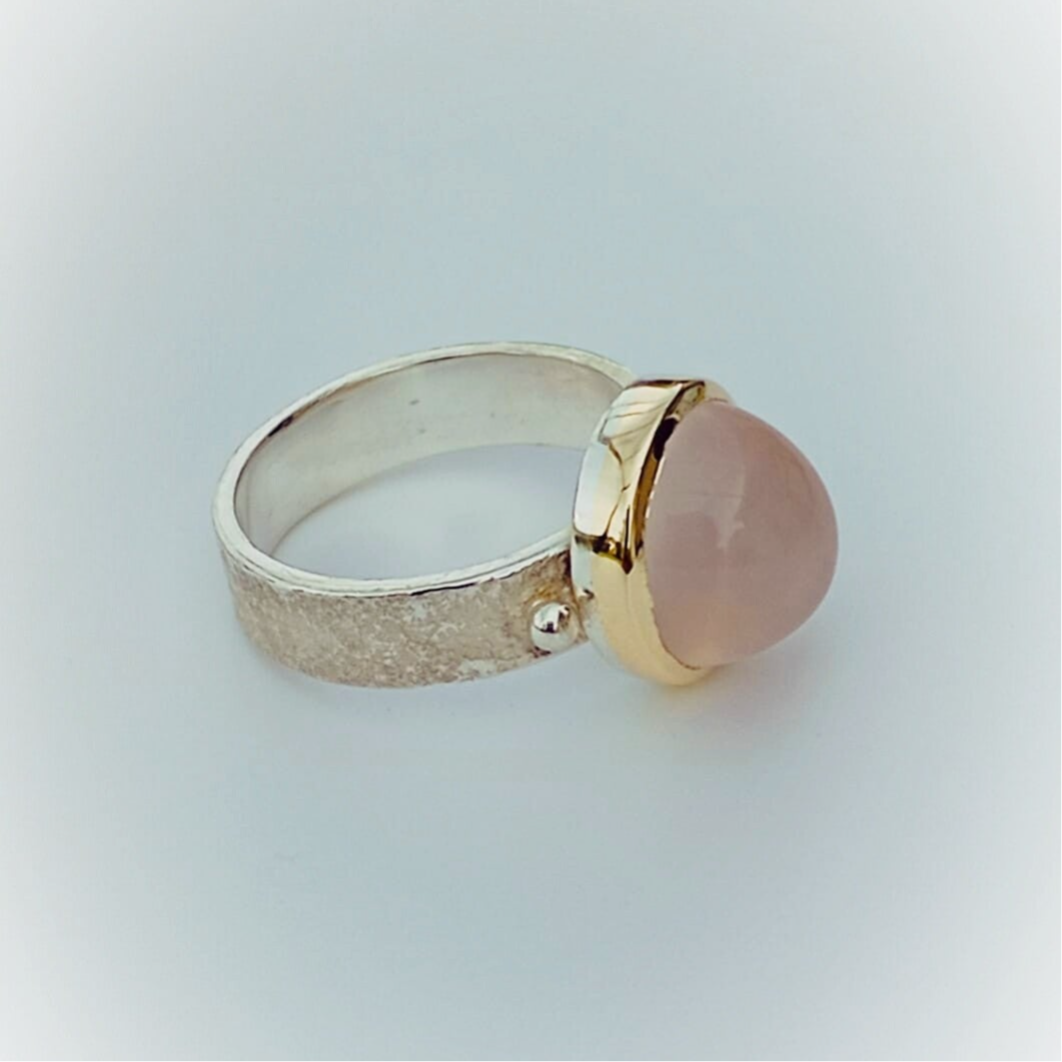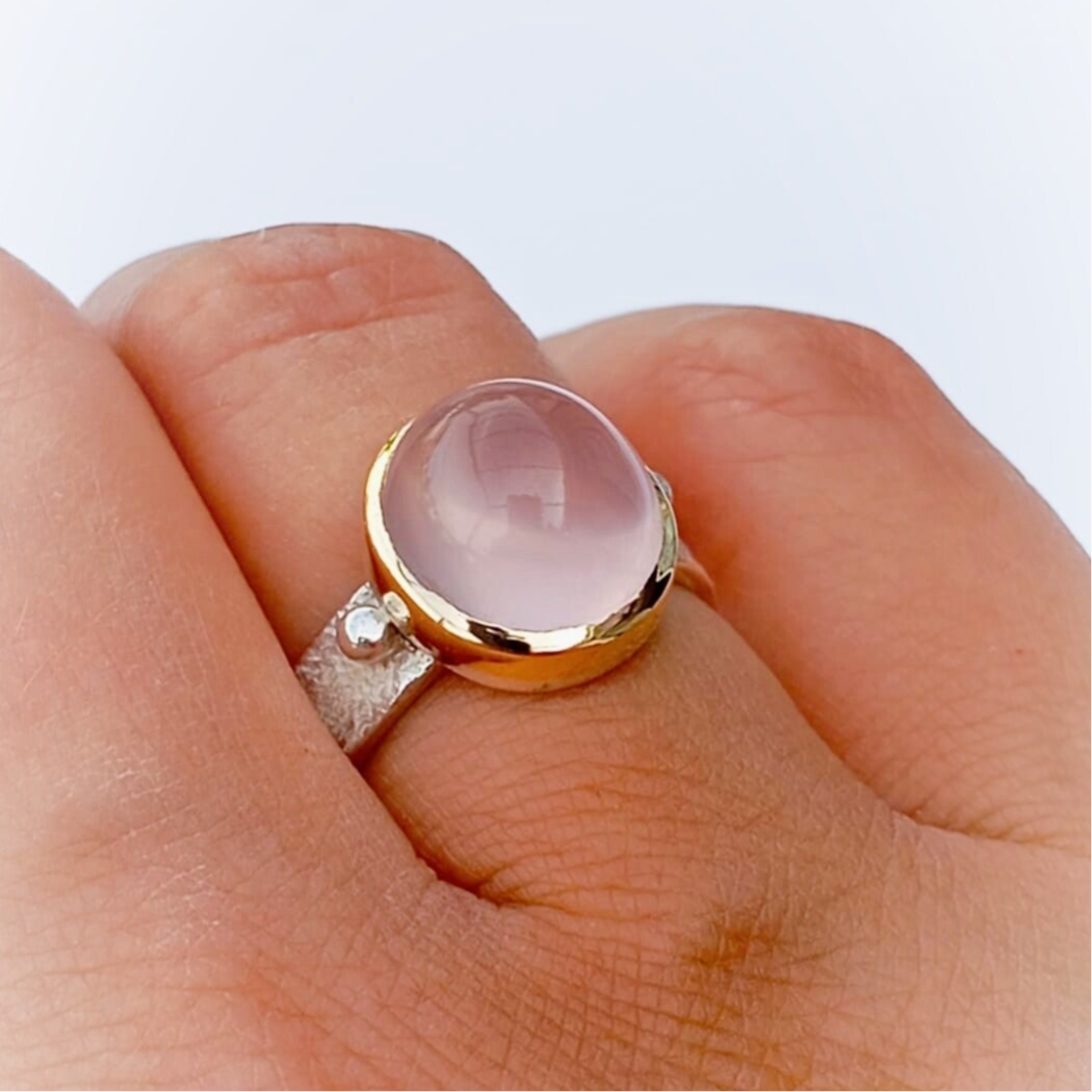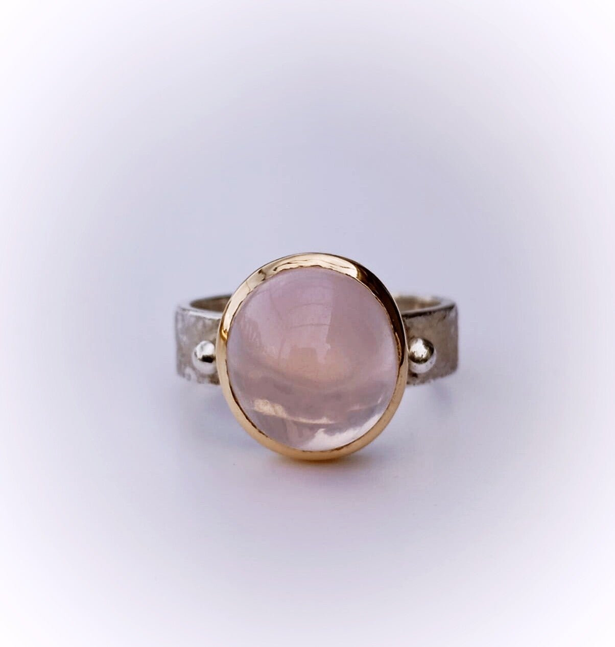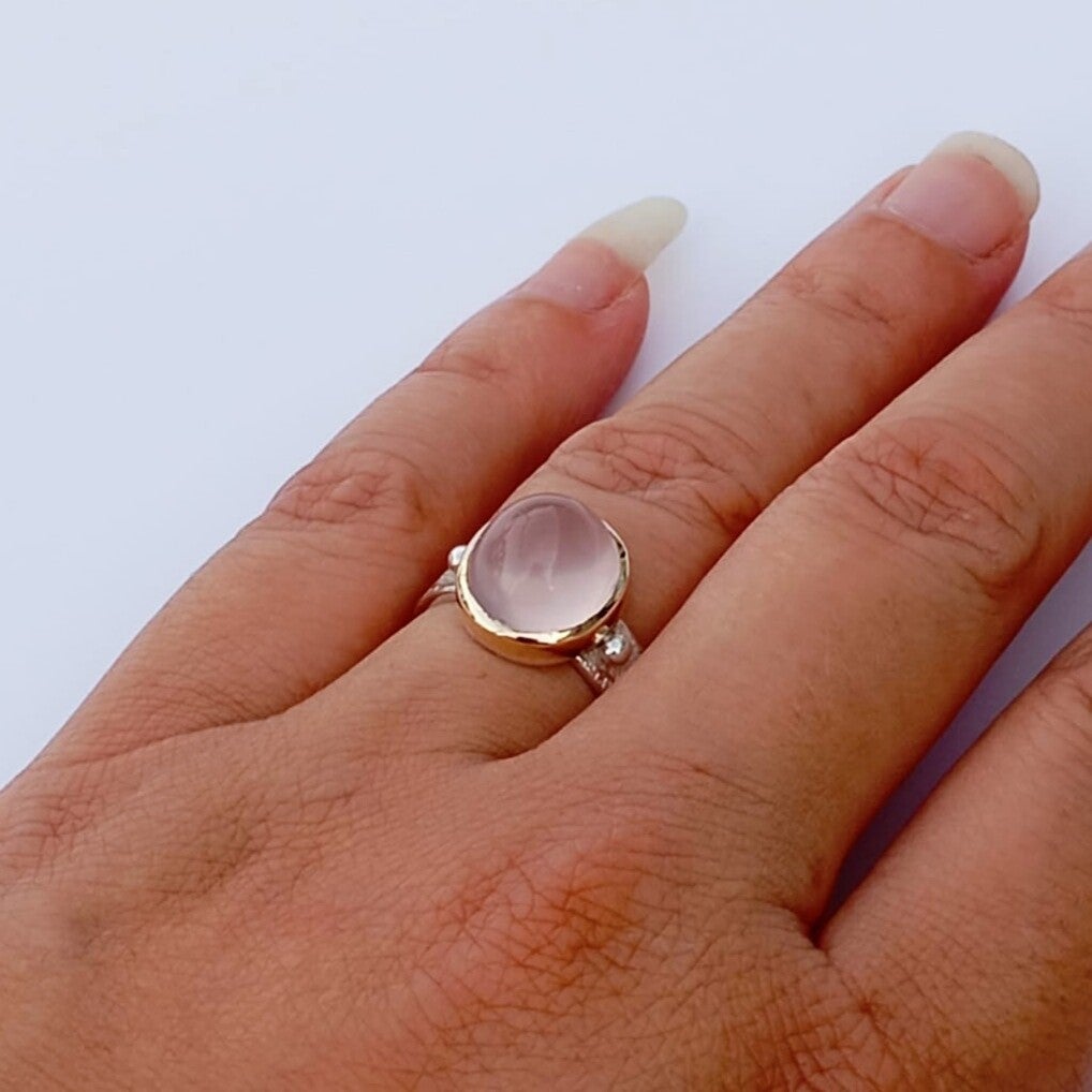 Un bijou délicat qui marie la douceur du quartz rose, pierre de l’amour et de la tendresse, à l’éclat intemporel de l’argent martelé. Son cabochon aux reflets doux capte la lumière avec élégance, tandis que son serti sobre met en valeur toute la pureté de la pierre.